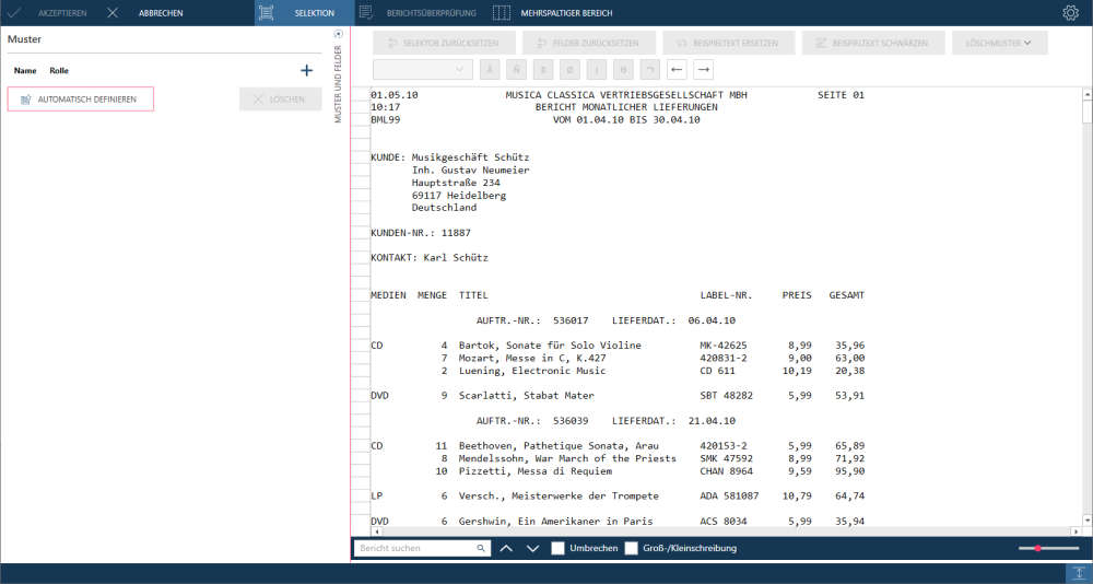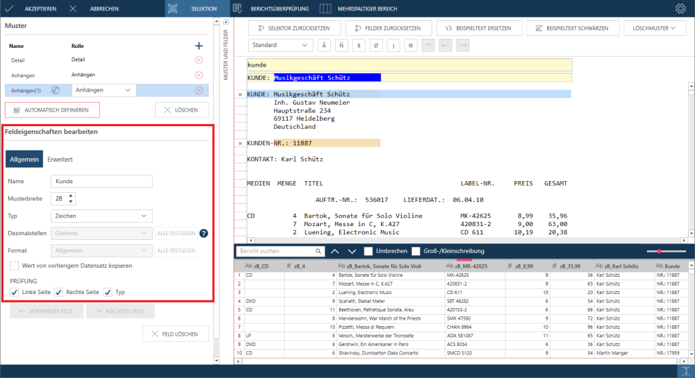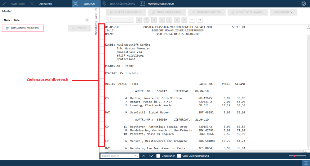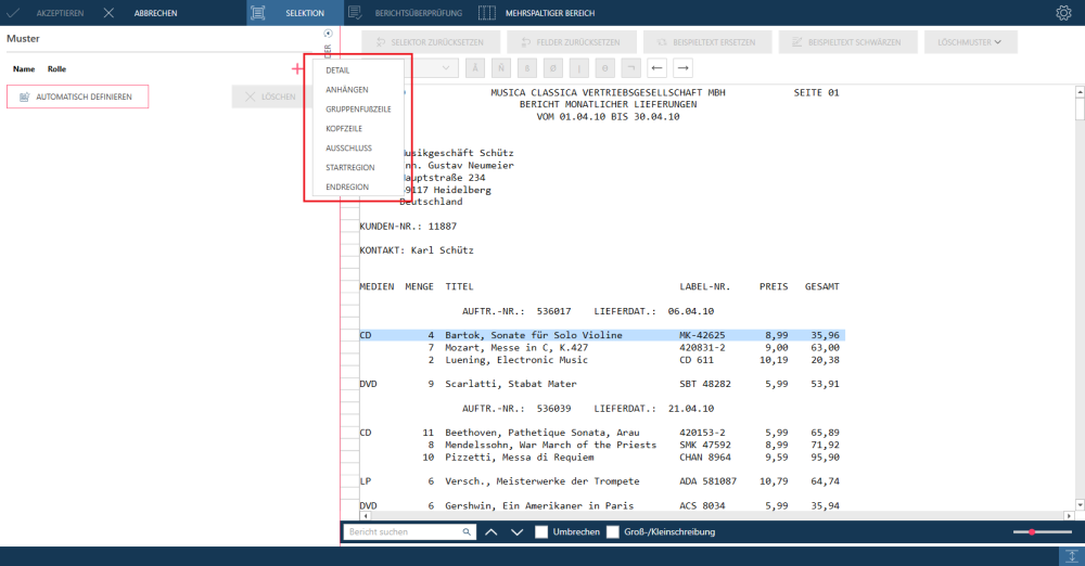 In einigen Berichten befinden sich die Detailfelder auf mehreren Zeilen, d. h. in einem Textblock. Es kann jedoch auch sein, dass die erste Zeile eines Textblocks nicht durch eindeutige Eigenschaften markiert ist.. Wenn Zeile 1 nicht verwendet werden kann, können Sie eine andere Zeile mit eindeutigen Eigenschaften angeben. In diesem Fall muss im Feld Selektorzeile die Beispielzeile angegeben werden, auf deren Basis die Selektion ausgeführt werden soll.