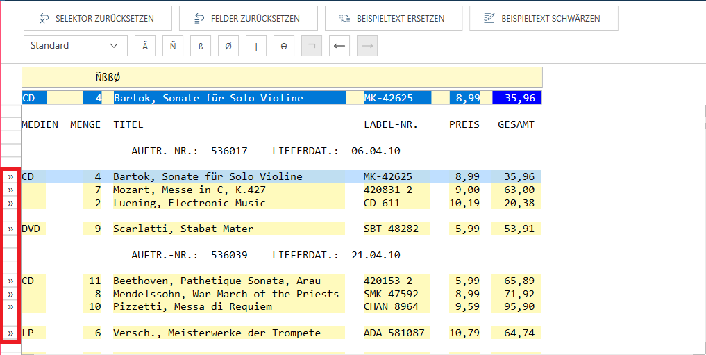 Die „Beispiel“-Textzeile und die „Selektorzeile“. Die Selektorzeile enthält einen definierten numerischen Selektor.