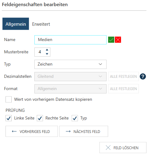 Geben Sie dem Feld einen geeigneten Namen indem Sie auf das Kästchen Name klicken und den aktuellen Namen durch einen neuen ersetzen. Klicken Sie auf das Häkchen neben dem Feld, um den neuen Namen zu bestätigen.