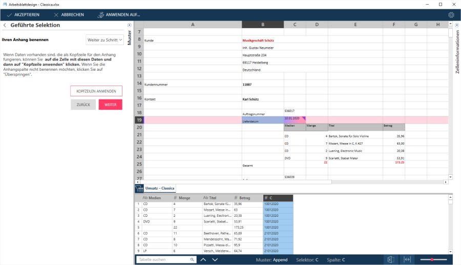 Wenn Sie Kopfzeilen ausgewählt haben, werden diese angewendet. Sie werden in der Vorschautabelle sowie in der Liste der Selektoren wiedergegeben: