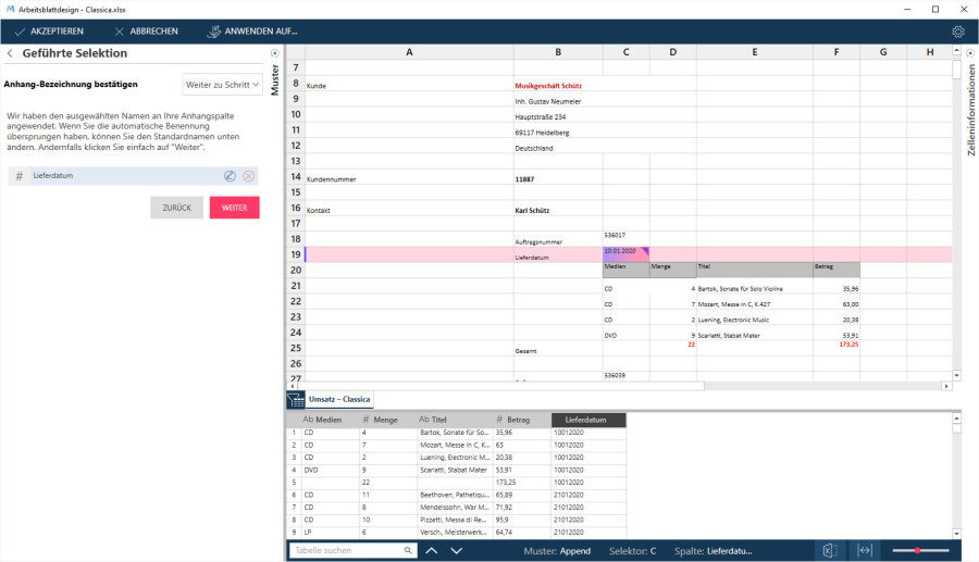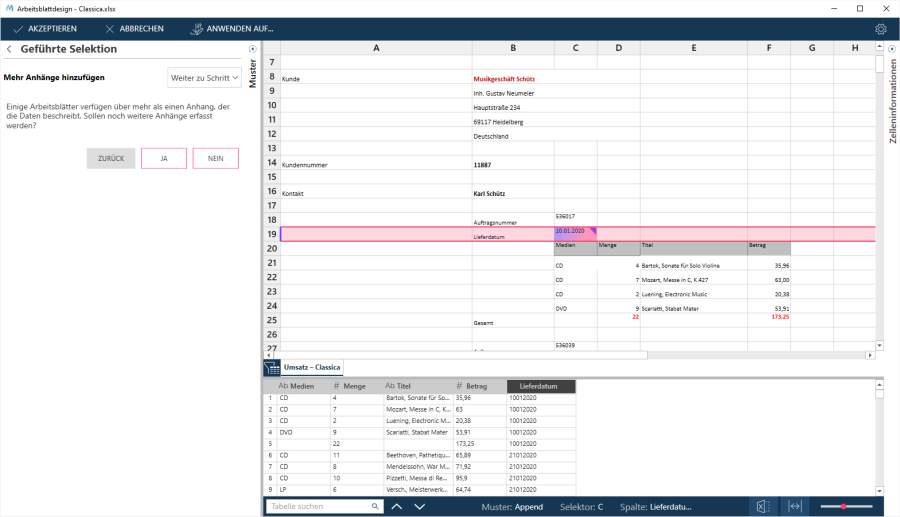 Nach Auswahl einer Anhängezelle werden die Werte der Vorschau hinzugefügt:
