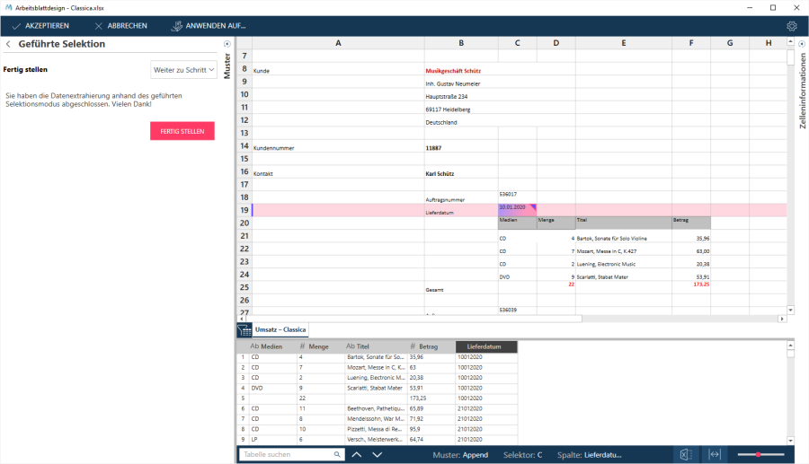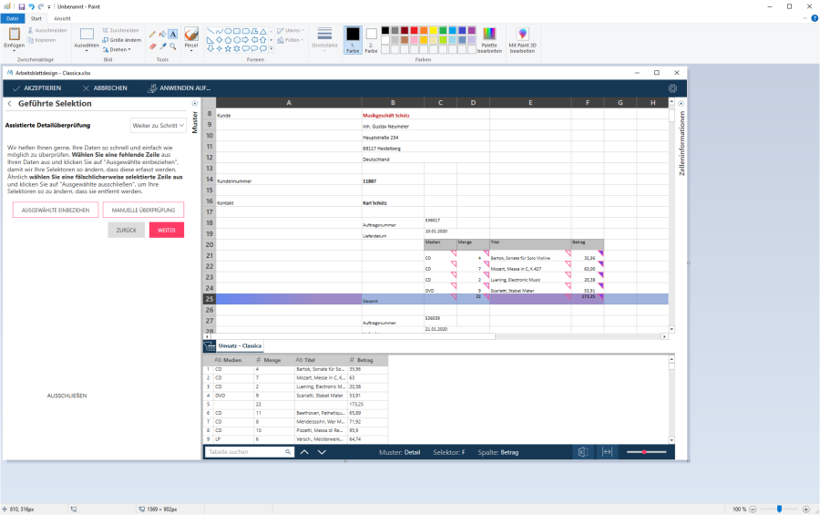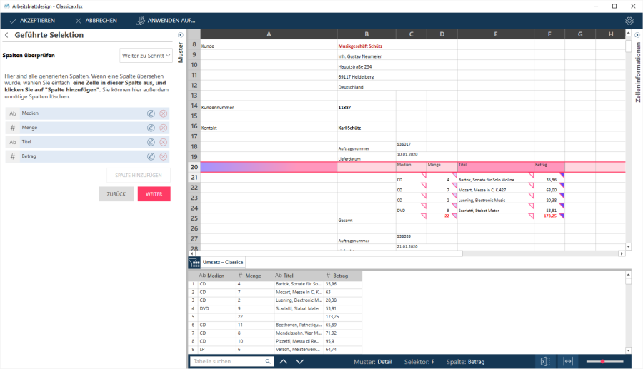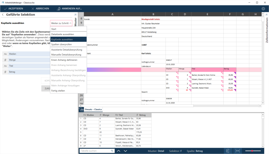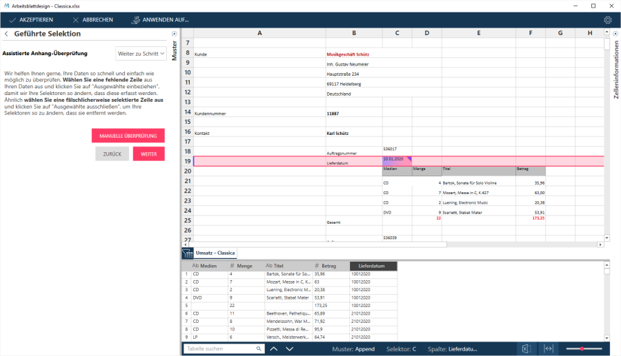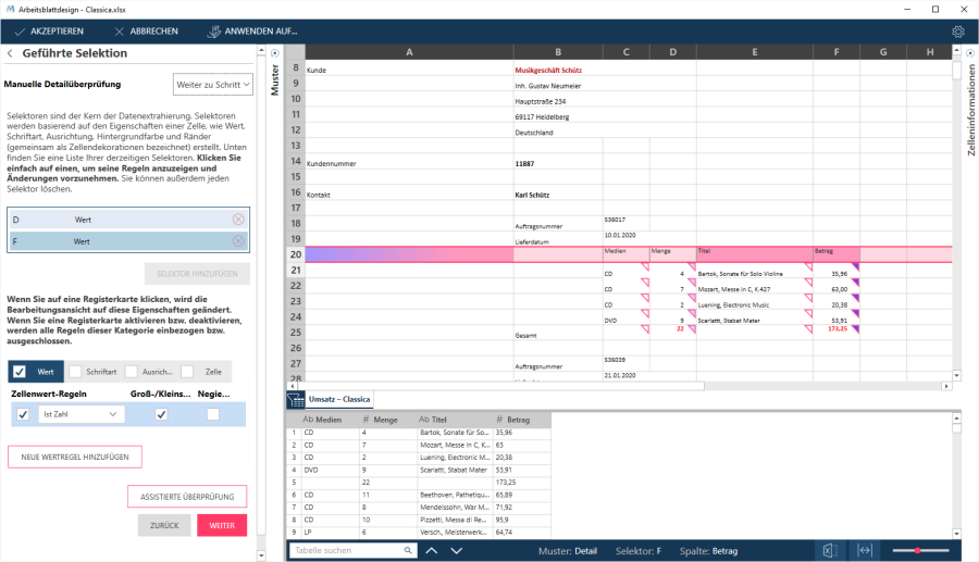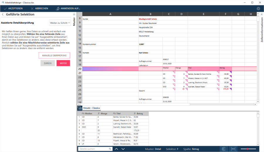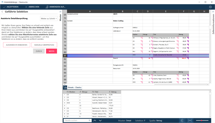 Bei dieser Methode wählen Sie Detailzeilen aus bzw. ab und der Assistent versucht die Selektoren so zu anzupassen, dass Ihre Auswahlkriterien erfüllt werden.