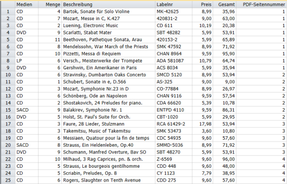 In der Tabelle erscheint eine Spalte PDF-Seitennummer (letzte Spalte rechts im Beispiel unten) mit der Seitennummer jeder Zeile in der Tabelle.