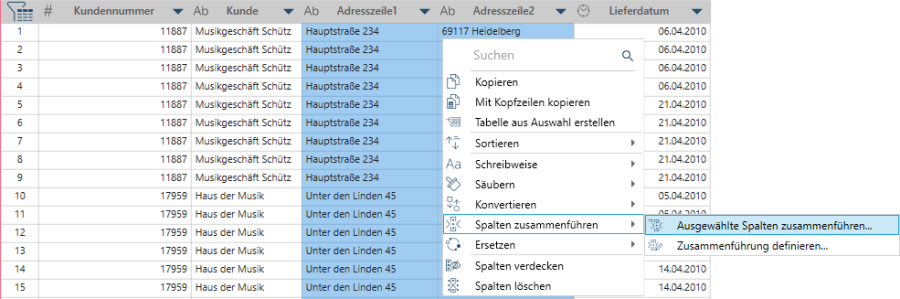 Spalten lassen sich durch das Hervorheben der zusammenzuführenden Spalten und die anschließende Auswahl von Spalten zusammenführen leicht zusammenführen. Sie können eine Schnellzusammenführung ausführen oder eine Zusammenführung mit Hilfe des Dialogfeldes Zusammenführung definieren erstellen.