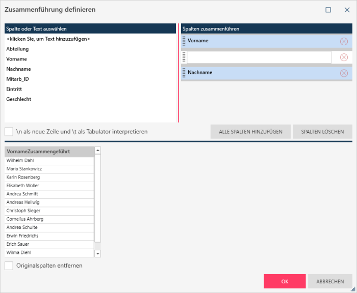 Standardmäßig wird die neue Spalte <Name der ersten Spalte>MergeText genannt. Nennen Sie die Ausgabespalte nach Wunsch um.