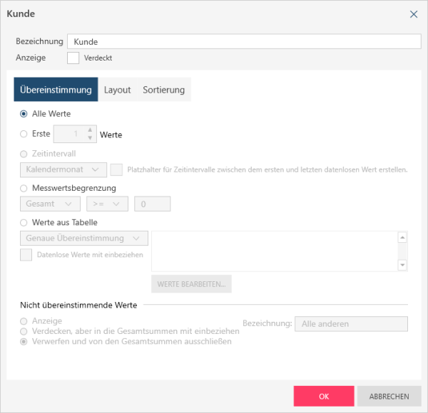 Beachten Sie bitte, dass das Ändern von Feldnamen in der Summierungsanzeige tatsächlich lediglich eine Änderung der Titel bewirkt. Im Dialogfeld Hinzufügen/Bearbeiten werden weiterhin die Originalnamen der Quellenfelder verwendet, nur die Summierungsanzeige zeigt die geänderten Titel an.