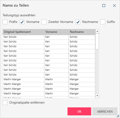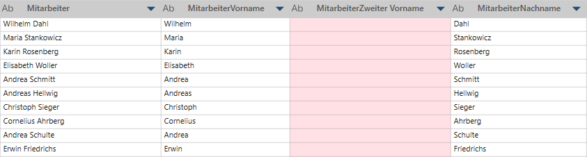 Im Beispiel unten ist „Mitarbeiter“ die Originalspalte und die verbleibenden 3 Felder auf der rechten Seite sind das Ergebnis der Namensaufteilung.
