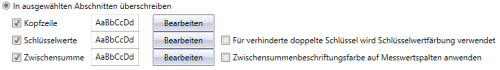 Markieren Sie Für verhinderte doppelte Schlüssel wird Schlüsselwertfärbung verwenden, wenn für verhinderte Schlüsselduplikate die gleichen Farben wie für die Schlüsselwerte verwendet werden soll. Markieren Sie Zwischensummenbezeichnungsfarbe auf Messwertspalten anwenden, wenn für Messwertspalten die gleichen Farben wie für die Zwischensummenbezeichnung verwendet werden sollen.