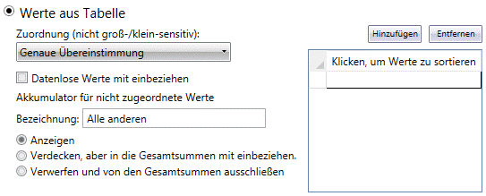 Klicken Sie auf „Datenlose Werte mit einbeziehen“, um Werte ohne Daten einzuschließen, auch wenn für diese im Bericht keine übereinstimmenden Datensätze gefunden werden. „Akkumulator für nicht zugeordnete Werte“ wird zur Identifizierung aller Werte verwendet, die nicht in der Liste enthalten sind. Sie können auch festlegen, ob alle nicht zugeordneten Werte angezeigt, verdeckt oder verworfen werden sollen. |