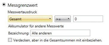 Wählen Sie diese Option, wenn die Summierung nur solche Schlüsselfeldwerte enthalten soll, bei denen eine ausgewählte Messwert-Zwischensumme entweder einer oberen oder unteren Grenze entspricht. Die untere Grenze wird durch „mindestens n“ und die obere Grenze durch „höchstens n“ ausgedrückt.