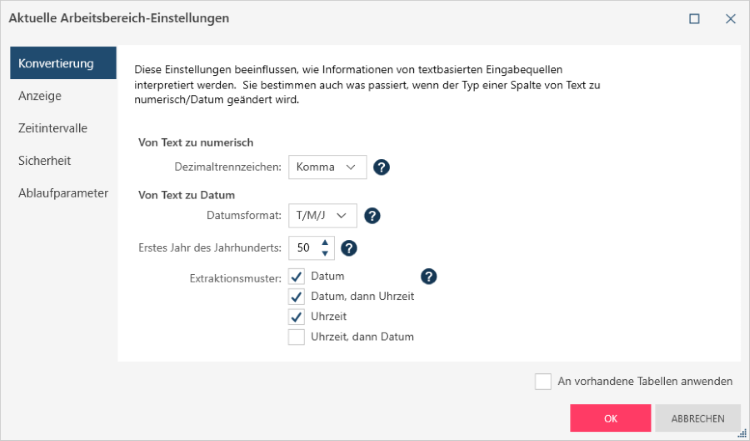 Wenn Sie das Kontrollkästchen Auf bestehende Tabellen anwenden aktivieren, werden alle Einstellungen auf alle offenen Tabellen im aktuellen Arbeitsbereich und auch im neu erstellten Arbeitsbereich angewendet. Wenn dieses Kontrollkästchen nicht markiert ist, reflektieren nur Tabellen im aktuellen Arbeitsbereich Ihre Konvertierungseinstellungen.