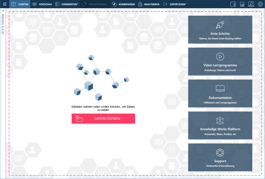 Die Startseite wird angezeigt, wenn Sie die Data Prep Studio-Anwendung starten oder Start auf der Monarch Data Prep Studio-Symbolleiste auswählen.