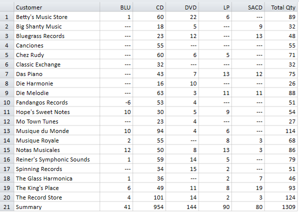 In einer horizontalen Schlüsselfeldsummierung werden die summierten Informationen über zwei Felder in einer zweidimensionalen Matrix angezeigt. In der folgenden horizontalen Schlüsselfeldsummierung für eine Musikvertriebsgesellschaft werden die Verkäufe pro Kunde angezeigt, und zwar unterteilt nach Medientypen.