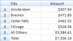 Durch diese Option werden die ersten n Werte angezeigt, die in der Summierung verfügbar sind. Der Wert n stellt dabei eine von Ihnen angegebene Zahl dar. Durch das Sortieren der Summierung können sich die Werte, die zurückgegeben werden, ändern. Diese Option kann beispielsweise zusammen mit der Sortieroption „Messwert“ (siehe Schlüssel- und Elementfelder in einer Summierung sortieren) dazu verwendet werden, eine „Erste-n-Analyse“ der Daten zu erstellen (siehe nachstehende Abbildung).