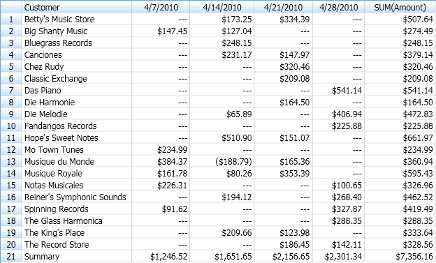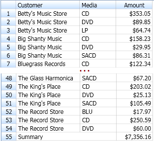 In Monarch Classic wird bei Erstellung einer Summierung eine Liste aller eindeutigen Werte in den einzelnen Schlüsselfeldern zusammengestellt. Diese Listen werden zusammengefasst und bilden dann die Summierungsmatrix. Jede Zeile in dieser Matrix stellt einen Satz eindeutiger Schlüsselwerte dar. In der folgenden Summierung werden z. B. die Felder „Kunde“ und „Medien“ benutzt. Das Feld „Kunde“ enthält 20 eindeutige Werte, nämlich je einen für die einzelnen im Bericht genannten Kunden. Das Feld „Medien“ enthält 5 eindeutige Werte (je einen für die einzelnen im Bericht genannten Medientypen). Aus diesen beiden Feldern kann eine Summierungsmatrix von bis zu 100 Zeilen (20 Kunden x 5 Medientypen) erstellt werden. In der Praxis würde die Summierung allerdings wahrscheinlich weniger Zeilen enthalten, da sicher nicht alle Medientypen für jeden Kunden in Frage kämen (siehe nachstehende Abbildung).