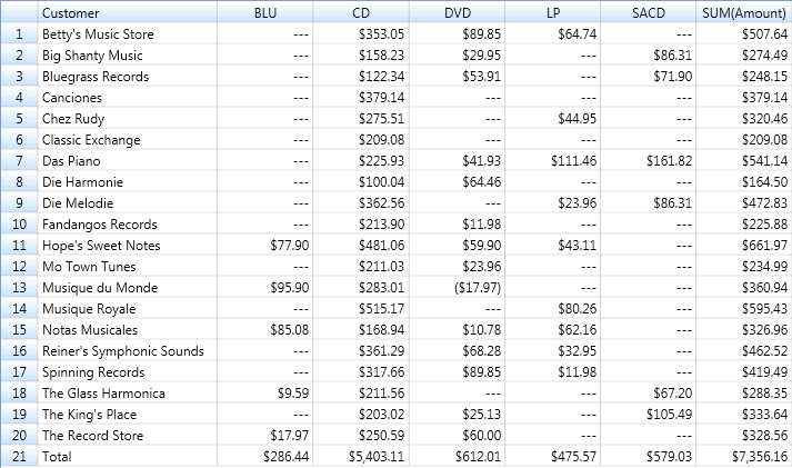 Das Summierungsfenster wird dazu verwendet, eine Analyse der Daten zu erstellen, die Summierungsbericht oder einfach Summierung genannt wird. Eine Summierung fasst Informationen über ausgewählte Felder tabellarisch zusammen und stellt die Ergebnisse in einer ein- oder zweidimensionalen Matrix dar. Die unten aufgeführten Summierungen zeigen beispielsweise die Umsätze einer fiktiven Vertriebsgesellschaft für klassische Musik nach Kunde und dann nach Medientyp an.