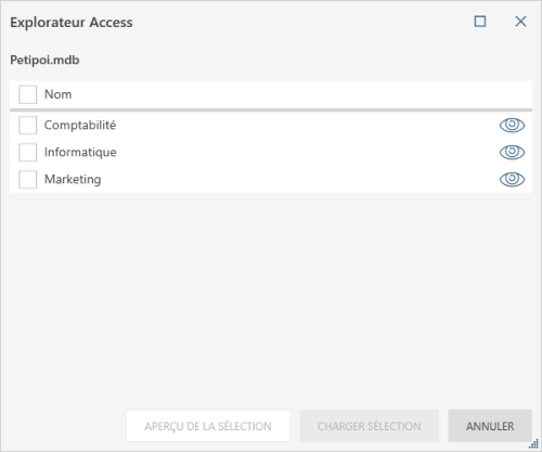 Notez que quand certains types de fichiers, notamment Microsoft Access et Excel, sont utilisés comme source de données, une boîte de dialogue (aussi appelée explorateur) s’affiche et vous demande de spécifier d’autres options avant de charger les données dans votre espace de travail.