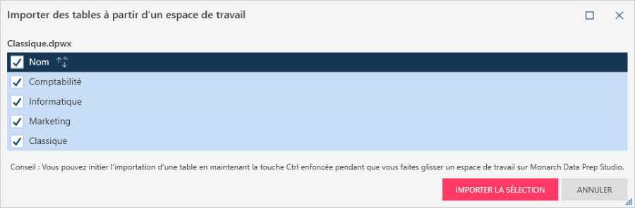 Si l'espace de travail contient une seule table (enfant), cette table (ainsi que ses tables parents) est ajoutée à votre espace de travail Sinon, la boîte de dialogue Importer des tables à partir d’un espace de travail s’ouvre. Dans cette boîte de dialogue, sélectionnez les tables de l’espace de travail que vous souhaitez ajouter à votre espace de travail actuel.