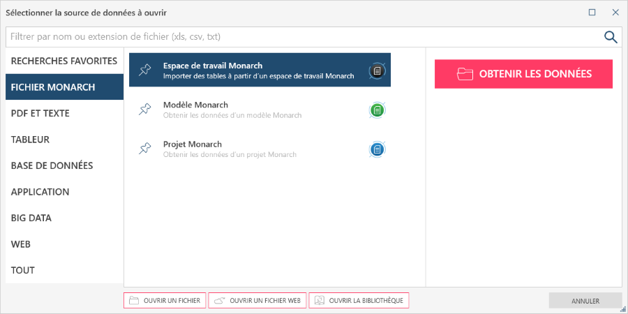 Vous pouvez aussi, à la page de départ ou dans la fenêtre Aperçu ou Préparer, sélectionner Ouvrir les données (à la page de départ) ou Ajouter(dans les fenêtres Aperçu ou Préparer) pour ouvrir la boîte de dialogue Sélectionner la source de données à ouvrir. Dans cette boîte de dialogue, sélectionnez |Fichier Monarch> Espace de travail Monarch > Obtenir les données.