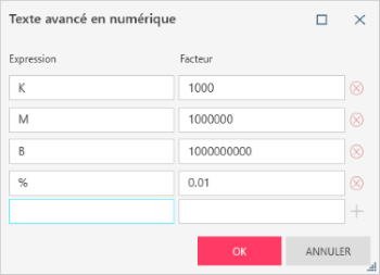ATTENTION : Vous pouvez définir une nouvelle combinaison de Phrase et Facteur dans la boîte de dialogue Conversion texte avancé en numérique :