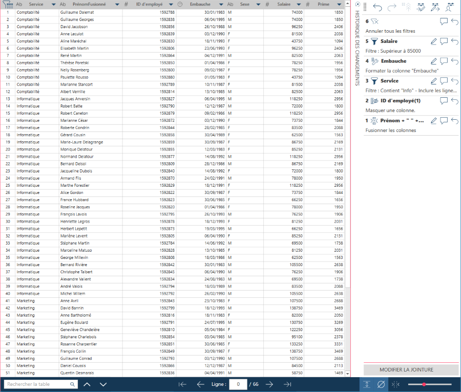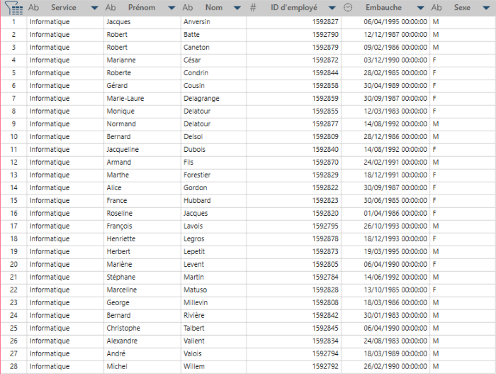 Dans l’exemple ci-dessous, vous voyez les résultats du filtre défini par l’illustration de l’étape 3. Ici, la table d’origine contient les valeurs « Comptabilité », « Informatique » et « Marketing » dans le champ Service.