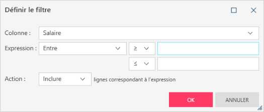 Entre – Cet opérateur de filtrage vous permet de définir des plages numériques. Quand il est sélectionné, vous devez aussi sélectionner un opérateur dans chacun de ces jeux d’opérateurs (c.-à-d.supérieur à/supérieur à ou égal à et inférieur à/inférieur à ou égal à) pour identifier la plage à filtrer.