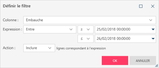 Vous pouvez filtrer les valeurs de date/heure et choisir de ne voir que les enregistrements contenant des valeurs de colonne qui se situent à l’intérieur d’une plage donnée, ou qui se situent avant ou après une valeur de date précise :