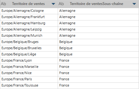 Dans cet exemple, la première colonne (Territoire de ventes) est la colonne d'origine. La deuxième colonne affiche les valeurs obtenues lorsque l'opération d'extraction est terminée.
