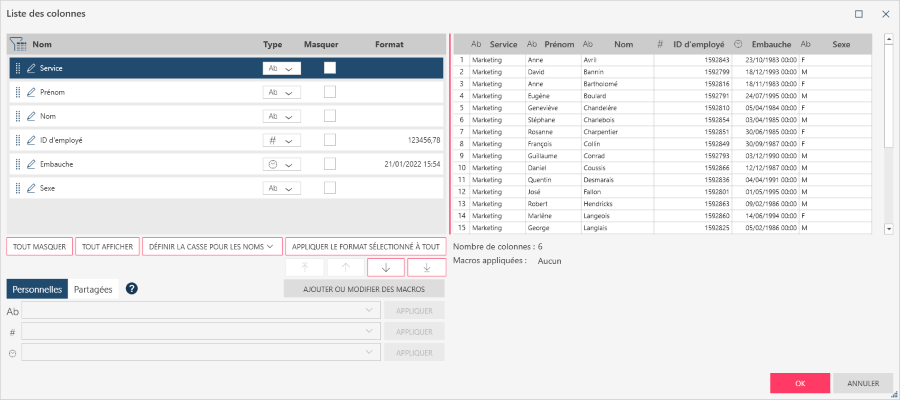 Afficher le nombre de colonnes comprises dans la table et les macros qui y sont appliquées