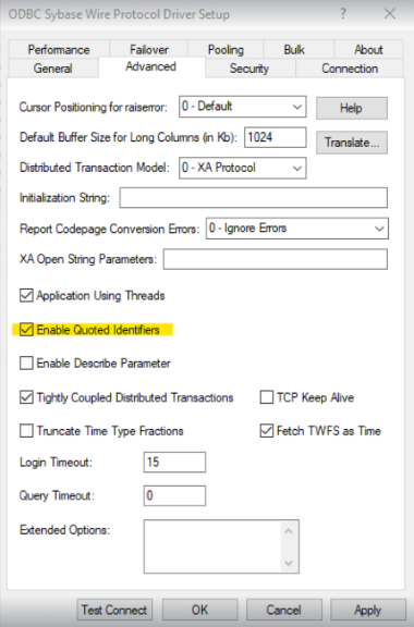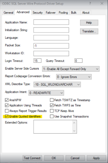 Activez « Enable Quoted Identifiers » dans les paramètres ODBC :