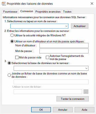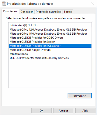 Ce connecteur fonctionne avec l’hypothèse qu’une source de données OLEDB a déjà été créée. Une fois sélectionnée, la boîte de dialogue Propriétés de liaison de données s’affiche :