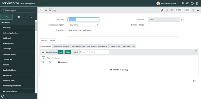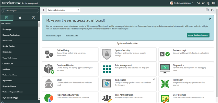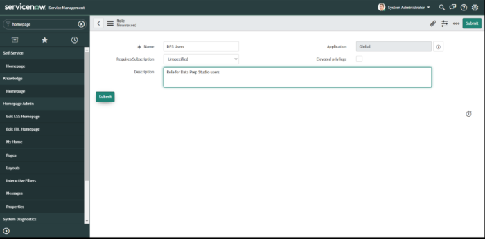 Définissez un nouveau rôle, revenez à la page d'accueil en cliquant sur le lien Homepage sous la section Self-Service du côté gauche de la liste de menus ou bien, dans le navigateur de filtres, tapez : « homepage ».