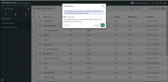 Sélectionnez System Administrator ou cliquez sur l’icône d'utilisateur du menu utilisateur en haut à droite de la page et choisissez Elevate Role :