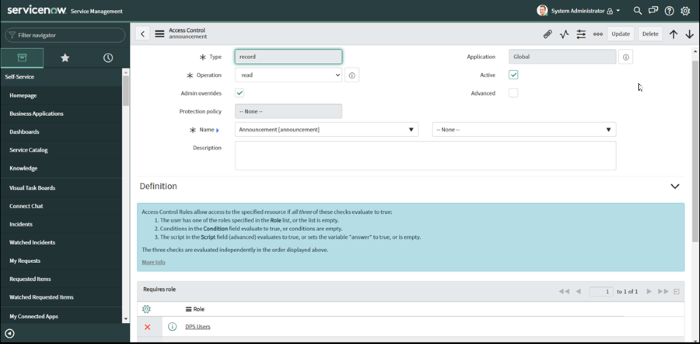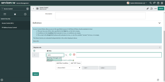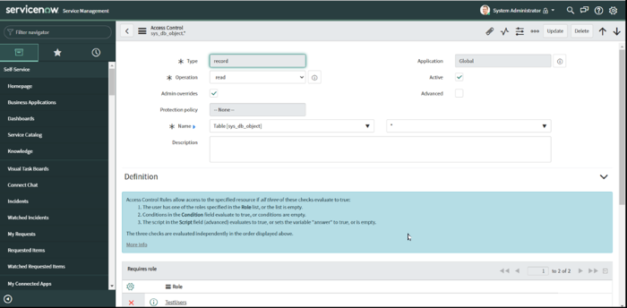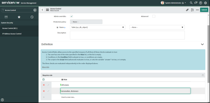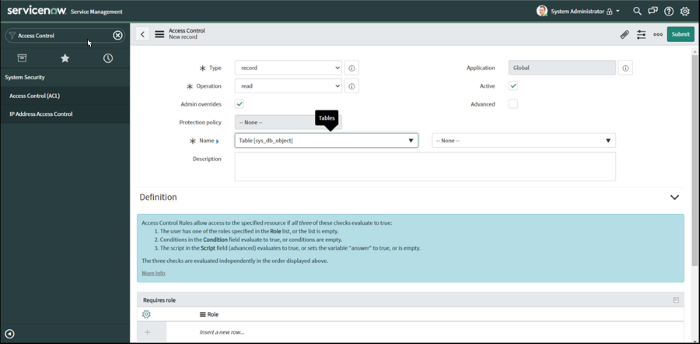 Ajoutez une nouvelle ACL pour accéder à la table sys_db_object, sous les paramètres suivants :