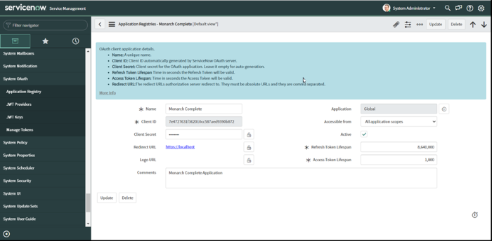 IMPORTANT : Pour que la connexion s’établisse dans Monarch Complete, réglez Redirect URL sur https:/localhost :