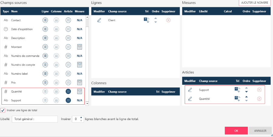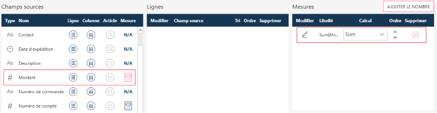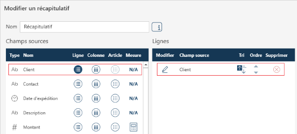 Si vous avez sélectionné plusieurs champs de ligne et souhaitez changer l’ordre d’affichage des lignes dans votre récapitulatif, cliquez sur les icônes Vers le haut ou Vers le bas sous la colonne Ordre pour agencer les lignes dans l’ordre de votre choix.