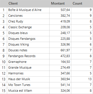 Dans l’exemple ci-dessus, neuf enregistrements uniques ont été trouvés pour Boîte à musique d’Aline dans le tableau d’origine. Neuf enregistrements uniques ont été trouvé pour Canciones, huit pour Chez Rudy, etc.