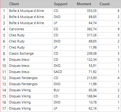 Dans ce cas, six enregistrements ont été trouvés pour Boîte à musique d’Aline vendant des CD, deux pour le même magasin vendant des DVD, un pour les ventes d’albums vinyle, etc.