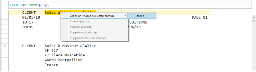 Par exemple, les sélecteurs suivants pourraient servir à capturer le champ Client dans Classique.prn :