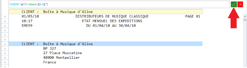 Les deux sélecteurs captureront le texte qui suit le champ Client dans l’état, mais le premier sélecteur ne capturera que les chaînes de texte qui commencent avec les lettres A à Z, alors que le deuxième capturera toutes les chaînes de texte qui commencent avec n’importe quel caractère alphanumérique. Par conséquent, le premier sélecteur ne captera pas le nom de client « 1999 Disques Bleus », alors que le deuxième le fera. Les deux sélecteurs captureront le nom de client « Boîte à musique d'Aline ».
