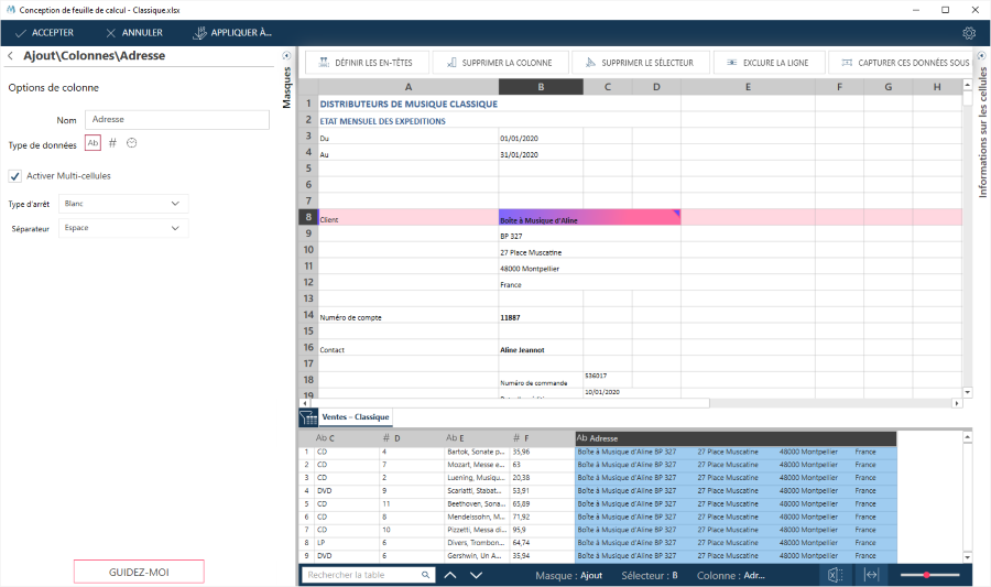 L’aperçu montre comment l’adresse est extraite et affichée avec un espace comme délimiteur :