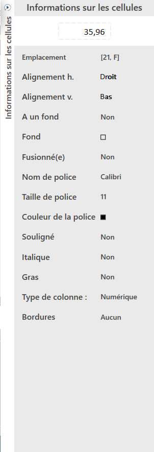Utilisez le panneau Informations sur les cellules, sur la droite de la fenêtre Conception de feuille de calcul, pour consulter les propriétés des cellules qui peuvent vous aider à ajuster vos sélecteurs :