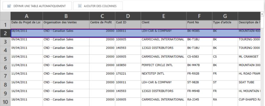 Vous pouvez aussi mettre une table en surbrillance et demander à la conception de feuille de calcul de définir les sélecteurs et les colonnes automatiquement. C’est la méthode optimale si vous avez des blocs de cellules contenant des données.