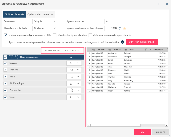 La boîte de dialogue Options de texte avec séparateurs vous permet aussi de spécifier un type de données pour chacun des champs de votre source de données CSV en utilisant les listes déroulantes Type sur la droite de chaque colonne. Vous pouvez aussi spécifier un seul (« en bloc ») type de données à appliquer à tous les champs de votre source de données via la liste déroulante Modifications de type en bloc.