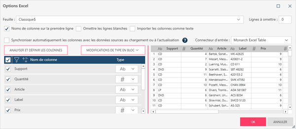 Pour rétablir les valeurs originales des types de données (telles que déterminées par le connecteur de tableau Excel Monarch), cliquez sur le bouton Analyser et définir les colonnes.