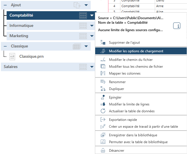 Dans la fenêtre Préparer, cliquez sur la flèche de liste déroulante à côté de la table Excel, CSV, HTML ou Access qui vous intéresse et choisissez Modifier les options de chargement.