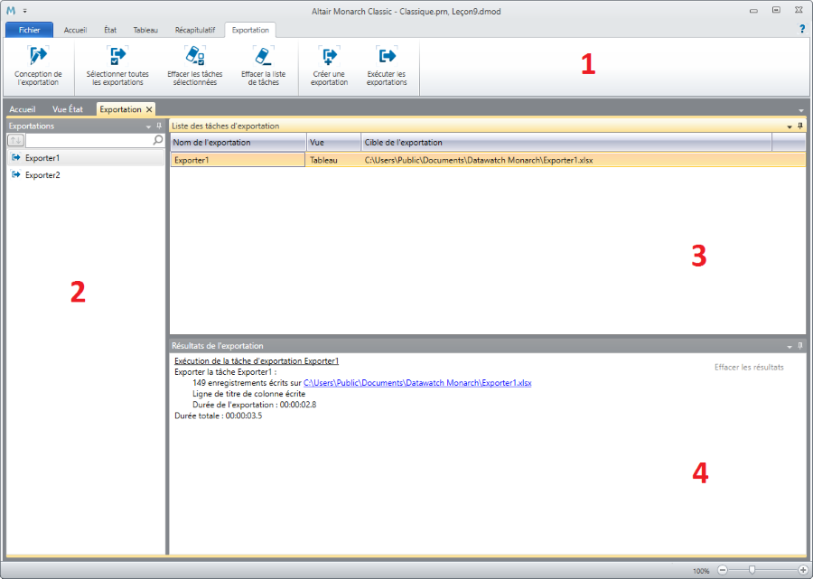 Affiche l'ensemble des exportations actuellement sélectionnées. Pour lancer toutes les exportations figurant dans cette liste, sélectionnez Lancer les exportations dans le ruban. |