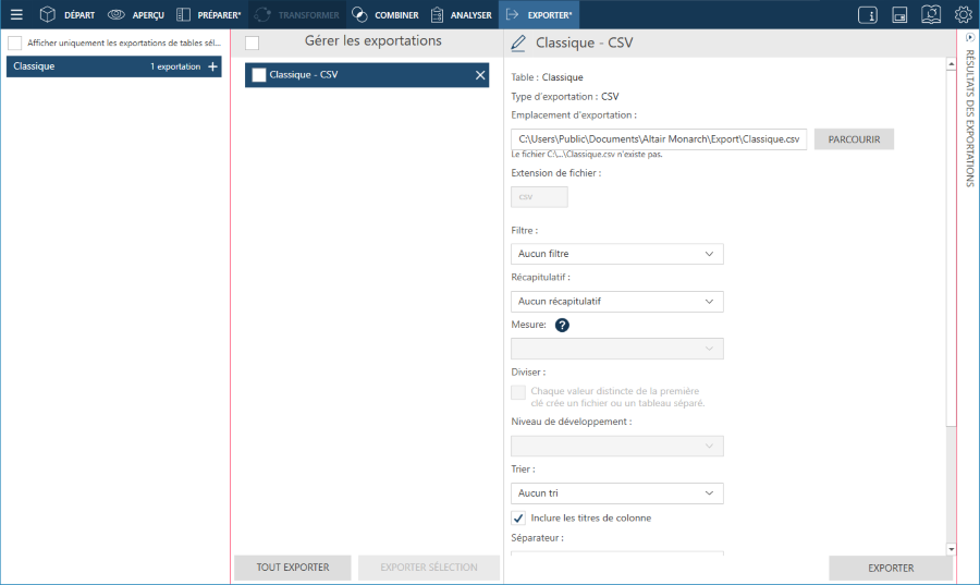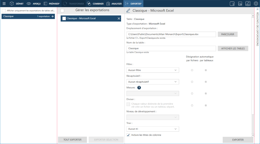 La table que vous avez sélectionnée s’affiche dans le panneau de gestion des exportations et ses propriétés s’affichent dans le panneau des propriétés d’exportation.