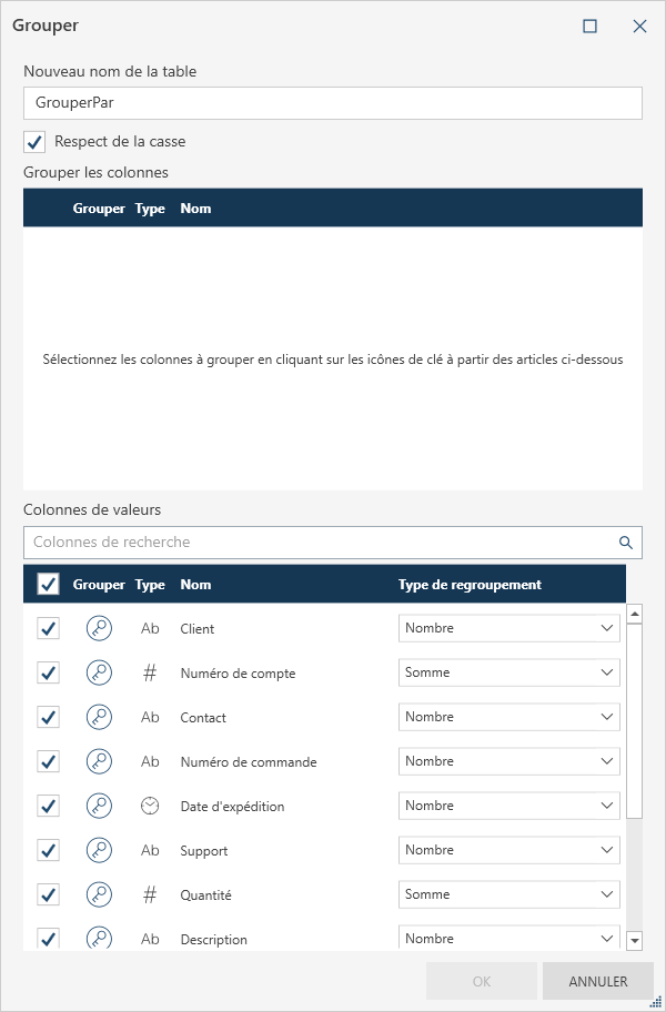 Cliquez sur le champ Respect de la casse si vous voulez différentier les valeurs en fonction de la casse. Par exemple, CD et cd sont considérées comme deux valeurs distinctes si le respect de la casse est activé et créeront donc deux groupes pour cette valeur.