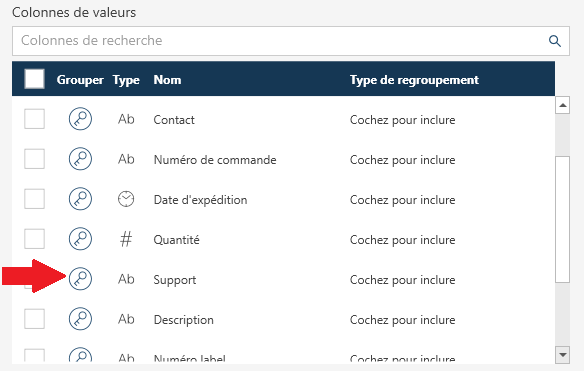 Sélectionnez les colonnes pour le groupement en sélectionnant l’icône de clé en regard d’une colonne dans la colonne Colonnes de valeurs de la boîte de dialogue :